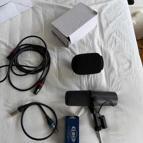 Selger Shure SM7B dynamisk mikrofon med tilbehør. Bordfestet fulgte ikke med, men kan fås med om ønskelig. Mikrofonen er egnet for tale, vokalopptak og kringkasting.
