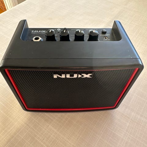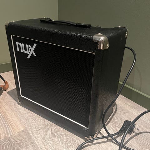NUX bassgitarforsterker i kompakt kabinett med bærehåndtak. Forsterkeren har flere kontroller for kanal, gain, bass, mid, treble, master og nivå for ulike effekter, samt inngang for gitar og hodetelefonutgang. Leveres med ekstern AC/DC-strømforsyning (modell NT-2600400D1, inngang 100–240 V, utgang 26 V 4 A). Egnet til øving og bruk i mindre rom der det er behov for en liten, elektrisk gitarforsterker.