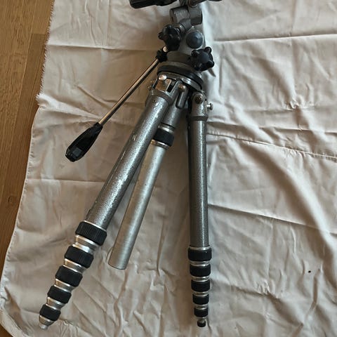 I god stand. Tripod med Kulehode på toppen. Teleskopiske ben med vrilås. Fungerer som det skal.
