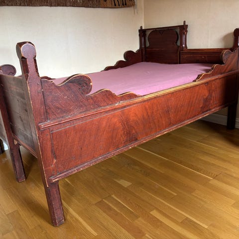 Hvitmalt mahogniseng; L: 193,5xB:75XH:70,5cm., kr. 300 og 2 stk skumgummimadrasser 190x75cm., kr. 50,- per stk. Seng og madrasser må hentes på adresse i Larvik.