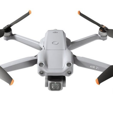 DJI Air 2S drone Fly More Combo i grå farge. Pakken inneholder sammenleggbar drone, fjernkontroll, to ekstra batterier, ladekabler, ladehub og skulderveske. Det følger også med et sett med ND-filtre til kameraet.