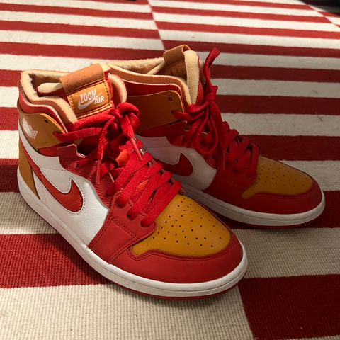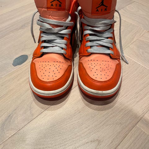 Nike sneakers/joggesko i størrelse 39. Modellen er en høy variant med snøring. Skoene har overdel i oransje, hvit og brun fargekombinasjon med klassisk Nike-logo på siden.