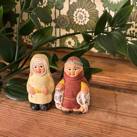 Samling med 8 vintage små miniatyr figurer i keramikk til settekasse. Arvet ,så alder er ukjent. Noen små skader på et par av de ,men for det meste i god stand :)