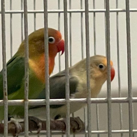 Selger dvergpapegøyeparet mitt, de er begge kjønnstestet, og det følger med 3 kg parakittbanding….Selges for alt, 1000 kr.