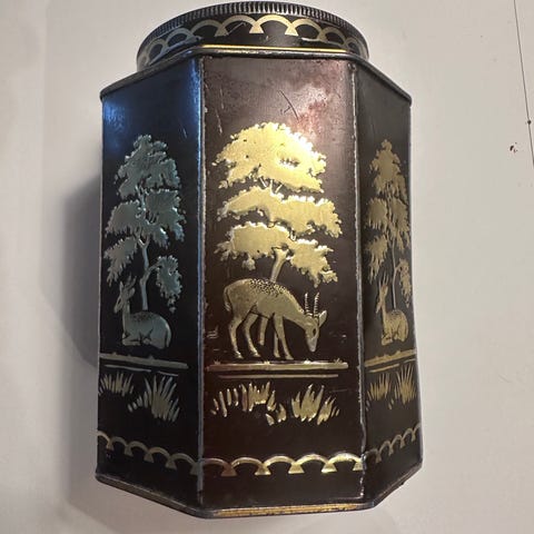 Høyde 12 cm, diameter 9 cm, relativt tung. Sekskantet. Unik sak med intakt stopper. Kobber eller bronse-legering.