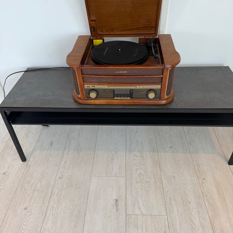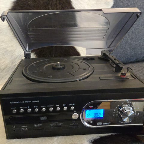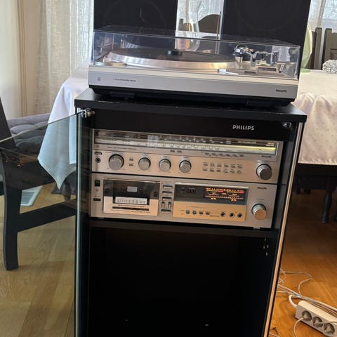 Philips musikkanlegg med innebygd platespiller, dobbel kassettspiller og radio. Anlegget leveres med to separate høyttalere. Platespilleren har støvlokk på toppen, og fronten har kontrollpanel med display, volumkontroll og funksjonsknapper. Dobbel kassettspiller gjør det mulig å spille av kassetter fra begge spor. Enheten er egnet for avspilling av vinylplater, kassett og radiokanaler i ett og samme anlegg.CD-en er det eneste som ikke fungerer.