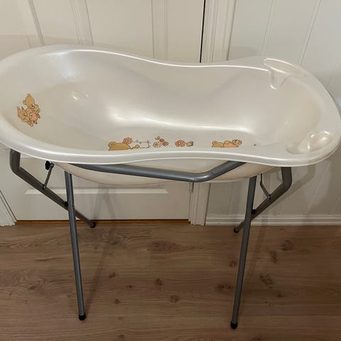 Twistshake sammenleggbart babybadekar i rosa. Badekaret står på et stativ med oppbevaringshylle under og nettinglomme på siden til såpe og småting. Badekaret kan brukes både på stativet og direkte på gulv, og kan foldes flatt for enklere lagring. Det følger med en myk, polstret innsats som festes med stropper for å gi ekstra støtte til babyen under bading.