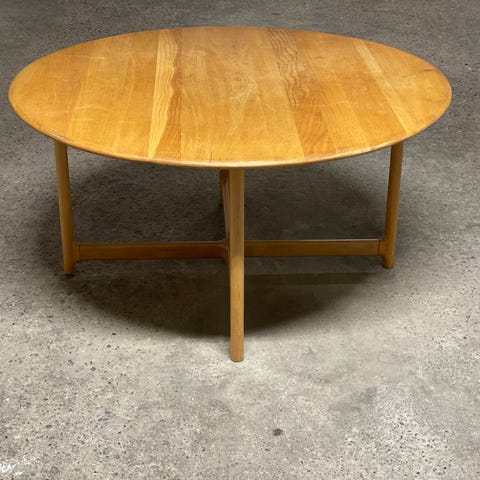 Selger et rundt spisebord i massiv eik. Det følger med en illeggsplate. Bordet har en flott livlig eikestruktur og er oljebehandlet. Klassisk dansk design fra 60 tallet.