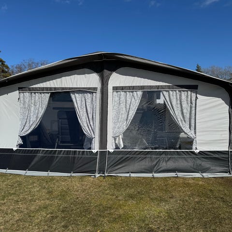 Velholdt helårstelt 687x300m. Ca 6-7 år gammelt. Det følger med skyvedør og takrenne!
