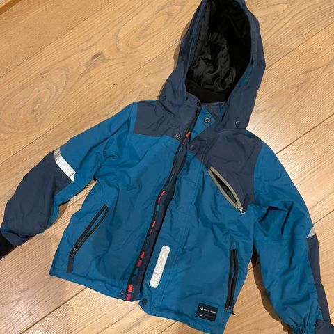 Polarn O. Pyret WeatherPRO jakke for barn, unisex, i størrelse 104. Jakken er blå og laget i polyester. Den har avtakbar hette, glidelås foran med trykknapper nederst og flere glidelåslommer. Innside med mykt fleecefôr. Ifølge merkelapp er jakken vanntett (vannsøyle >10 000 mm), vannavvisende, har tapede sømmer og pusteevne >5000 g/m²/24h. Den har resirkulert vattering, resirkulert fôr og slitesterkt ytterstoff. Reflekser rundt jakken gir synlighet fra flere vinkler. Egnet som ytterjakke til bruk i barnehage og utelek i variert vær.