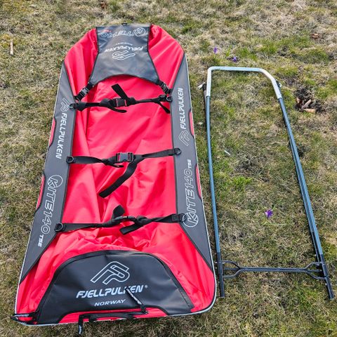 Pulk fra Fjellpulken med rød pulkpose/trekk. Leveres med komplett drag og polstret trekksele med skulderstropper.