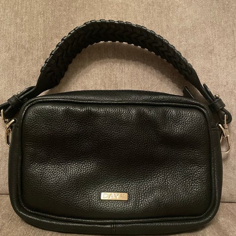 DAY ET skulderveske for dame i svart skinn. Vesken har justerbar skulderrem og klaff med spenne foran. Hovedrommet lukkes med glidelås og har lys innside med flere rom og glidelåslomme for bedre organisering. På forsiden er det en avtagbar clutch under klaffen. Vesken passer til hverdagsbruk og til å bære med seg nødvendigheter som lommebok, mobil og småting.