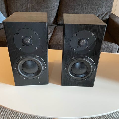 Yamaha studiomonitorer, aktivt høyttalerpar i svart med hvite basselementer. På baksiden finnes blant annet XLR- og jack-innganger, volumkontroll og bassrefleksport.