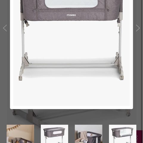 Fin, praktisk bedside crib fra Moweo med en myk, polstret madrass og oppbevaringsveske. Den har stilrene bein av tre som gir sengen en moderne stil.