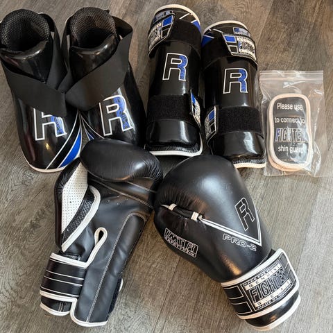 Sett med polstrede boksehansker og leggbeskyttere egnet til kampsporttrening som boksing, kickboksing eller annen slag- og sparktrening. Hanskene har lukking med borrelås rundt håndleddet for å gi støtte og holde dem på plass under bruk. Leggbeskytterne har justerbare stropper med borrelås på baksiden for å sitte stabilt rundt legg og vrist.
