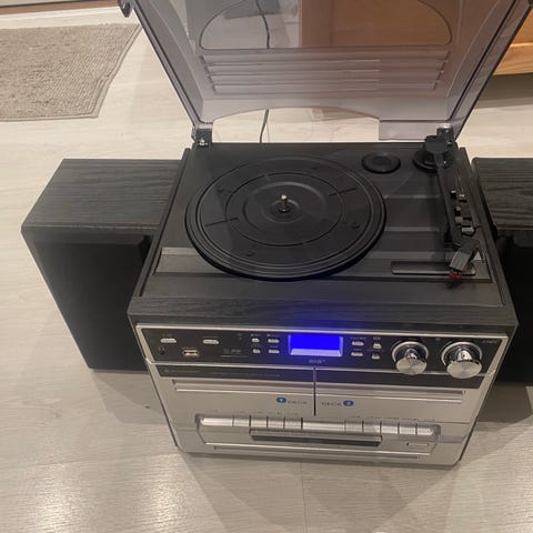 Plate og Cd spiller med recorder selges høystbydende. Det følger også med 2 ion høytalere. Alt virker, men det er ikke høytalere av beste kvalitet.