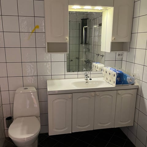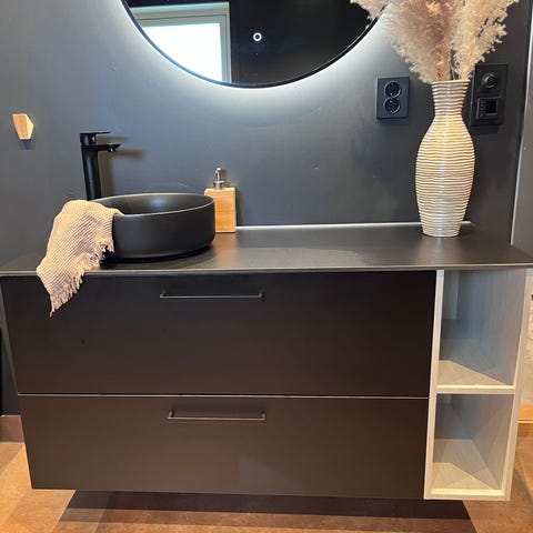 Baderomsinnredning med servantskap, speil og høyskap i eik. Innredningen er fra 82, men ser ikke brukt ut.