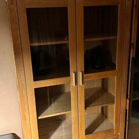 Pen skjenk og vitrineskap med glasshyller selges ved rask henting.