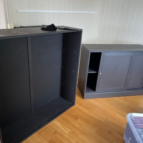 Mye oppbevaringsplass i skjenken. Skuffer nederst i vitrineskapet. Veldig praktisk møbelsett!