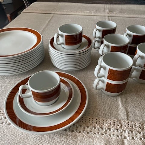 Bruk: Serviset ble produsert i mange deler, inkludert middagstallerkener, frokostasjetter (ca. 17–20 cm), kopper og fat.