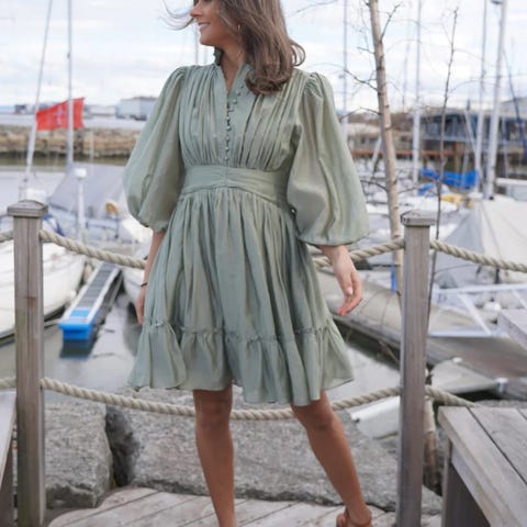 Golightly festkjole for dame i størrelse XL. Kjolen er blå og laget i polyester. Modellen har firkantet utringning, lange voluminøse ermer og utsvingt skjørt med kort lengde. Stoffet har en diskret glitrende struktur som gir et lett skinnende uttrykk. Egnet som festkjole til ulike anledninger. Selges da den ikke brukes nok! Nypris 2699kr