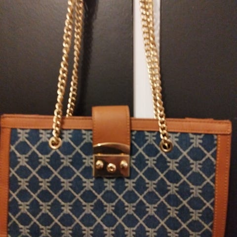 Pent brukt vintage skulderveske. Justerbar reim. Lukket rom med glidelås bak. To lukkede rom med glidelås i midten, samt to åpne. Veldig fin, men selges da den ikke brukes nok. Litt usikker på materialet, men mistenker lær.