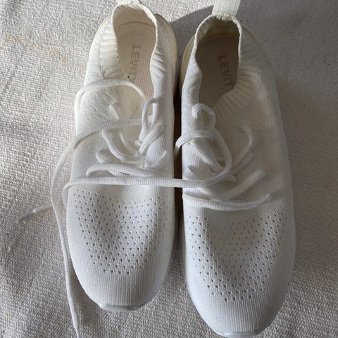 Levity sneakers joggesko i størrelse 45. Skoene er hvite med snøring foran og kraftig, mønstret yttersåle. Overdelen har perforert mønster for pusteevne, og det er hempe bak på hælen for enklere av- og påtaking. Passer som hverdagssko eller til lett trening og fritidsbruk.