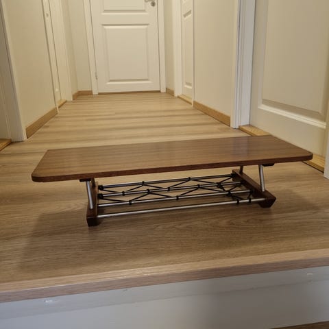Teak hyller med riktig type bøyler og muttere. Hyllene er ikke skadet, men bruksspor kan forekomme. Møbelsnekker kan kappe hyllene på lengde etter ønsket mål. De lengste hyllene er 88 cm. Jeg har også noen hyller i Valnøtt med lengde 85 cm. til samme pris. Hyllenes dybde kan variere mellom 20,5 og 21,5 cm.