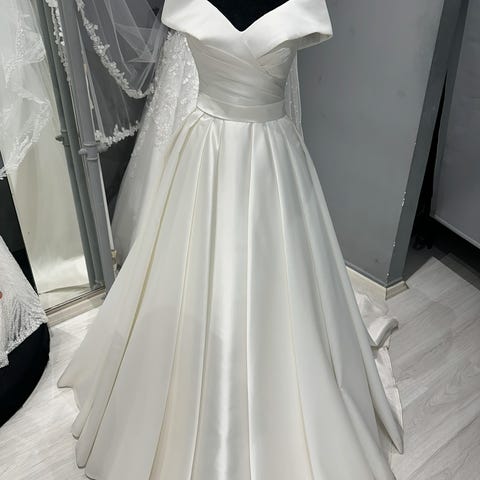 Selger min fine brudekjole som ble skreddersydd fra topp til tå av topp-kvalitets silke. Kjolen er elegant med langt slør (ca 2meter). Det er knyting bak, som vil si at den passer det meste fra størrelse 34-38.
