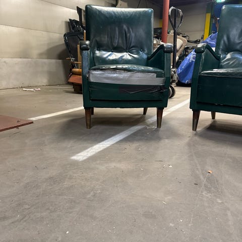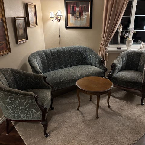 Veldig gammel sofa og to stoler. De bærer preg av å være gamle og godt brukt, men kan fint brukes.