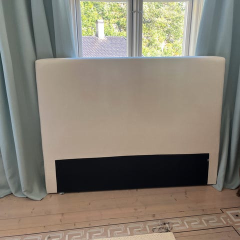 Pen og svært lite brukt sengegavl selges pga flytting. Trekket er vasket og gavlen står klar for å hentes. Beklager dårlige bilder.