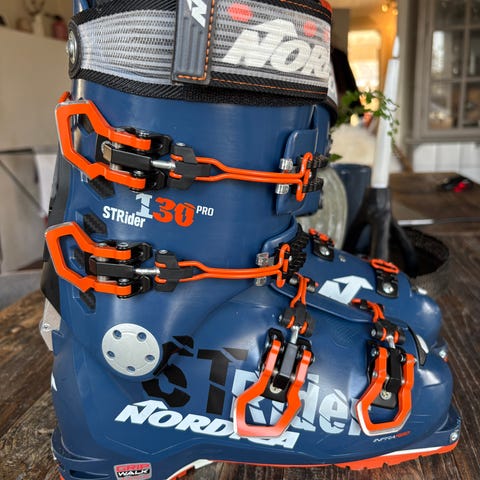 Nordica Strider 130 Pro alpinstøvler i størrelse 26.5. Støvlene har blå ytterskall med oransje spenner og detaljer. Modellen har fire mikrojusterbare spenner og powerstrap øverst for bedre tilpasning rundt leggen. Sålen har oransje friksjonsmateriale for bedre grep ved gange. Passer til alpint/frikjøring der det er behov for en stiv støvel med god kraftoverføring. Innsiden har polstret innerstøvel med hempe bak for enklere av- og påtaking.