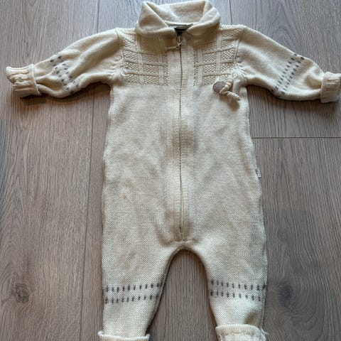 Lillelam ulldress for baby i størrelse 56. Dressen er i hvit ull og har glidelås foran. Ribbekanter ved ermer og ben gir god passform. Unisex-modell som passer både jente og gutt. Egnet som varmende plagg inne eller som mellomlag under yttertøy.