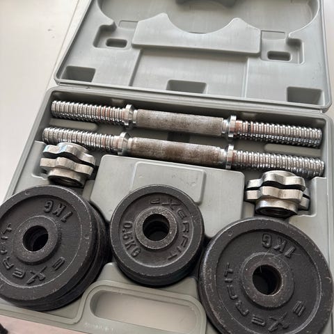 Et par justerbare dumbbells, tror maksvekt er ca. 7.5 kg (1.25 kg + 1.5 kg skiver på hver av dem, og hvert håndtak veier ca. 1 kg ), og en vekt på 8 kg (kan brukes til de fleste kettlebell- øvelser o.l.). Har bruksmerker, men fungerer fint. 300 kr for alle sammen, eller 100 per del. Kan ikke sendes.
