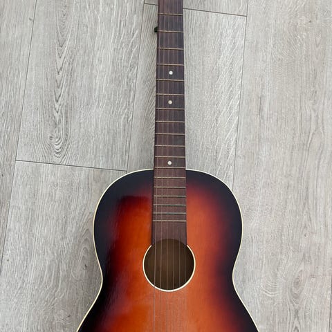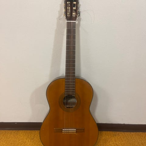 Akustisk gitar i klassisk stil med nylonstrenger. Kroppen har brun sunburst-finish med lys kantlist. Gitaren har slisset hode, mekaniske stemmeskruer og gripebrett med båndmarkeringer. Bakside av kroppen viser synlige sprekker i treverket. Egner seg som instrument for enkel spilling eller som dekorasjon. Merke og modell er ikke oppgitt.
