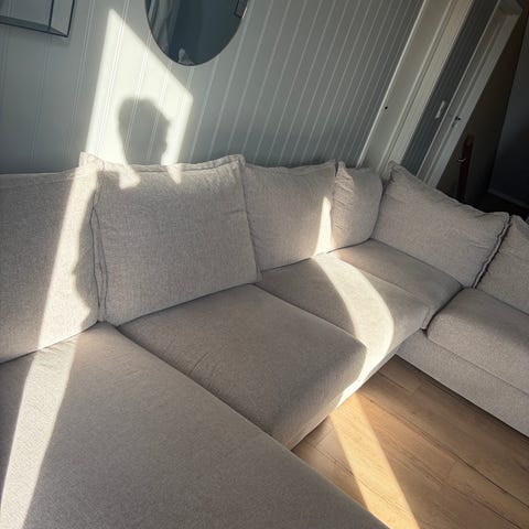 Avtagbare trekk som kan vaskes, vasket de nylig. Vendbare puter bortsett fra sitteputen i sjeselongdelen.