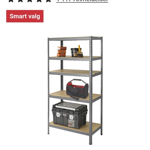 Reol i metall med trehyller i to varianter: én hjørnereol og én rett reol. Begge har flere hyllenivåer med spon- eller trefargede hyller og svart metallstamme. Egnet som lagringsreol i bod, garasje, kjeller eller verksted. Reolene gir god oppbevaringsplass for esker, verktøy og annet utstyr.