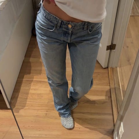 Buksen er laget i blå denim. Klassisk femlommersmodell med knappelukking foran. Høy i livet. Lite brukt og uten slitasje. Selges for å rydde plass i skapet!