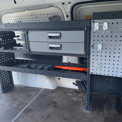 Bil-innredning som sto i Ford transit Connect. 5 skuffer på en side. 2 skuffer på andre side. Montert brannslukningsapparat følger med. Stativ for sprayboks Mål ca 166x33