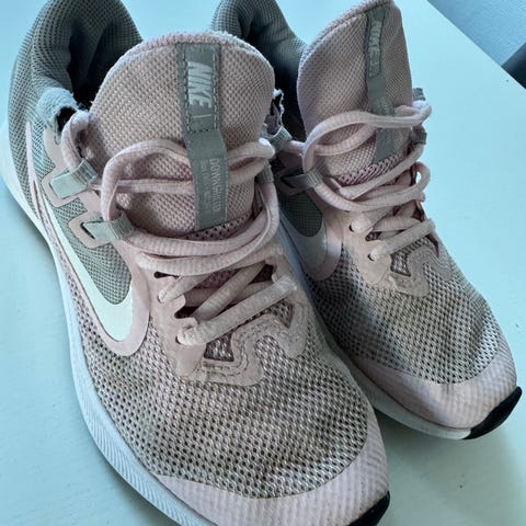 Skoene er i hovedsak hvite med røde detaljer, blant annet rød Nike-logo og rød yttersåle. Overdelen ser ut til å være i syntetisk materiale og mesh for ventilasjon, med polstret hælparti og snøring for justerbar passform. Yttersålen har mønster som gir grep ved løping på harde underlag. Egnet som løpesko eller til annen lett trening og hverdagsbruk.