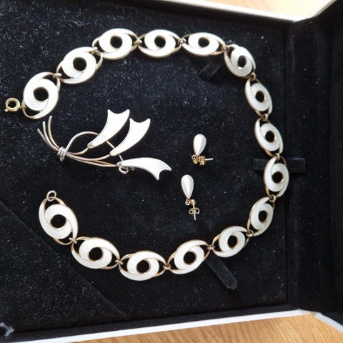 Selger et pent sølv emalje sett, bestående av Halskjede og Øredobber i samme serie. I hvit emalje med mønster, og med gullforgylt kant og bakside. Stemplet. 925S.HP (mesterstempelet til Harry Pedersen). Halskjedet har lengde 42 cm Øredobbene henger ned, og er med skrue bak. Smykkesettet er i god stand. Selger for 1000 kr +frakt.