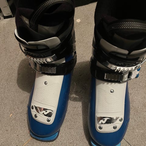 Telemarksko med 75 mm Nordic Norm-såle, egnet for klassiske 3-pins telemarkbindinger. Størrelse er merket som Mondo 245. Skoene har blå ytterskall med justerbare spenner og polstret innersko for støtte og komfort. Sålen har kraftig mønster for godt feste ved gange uten ski. Passer til bruk med telemarkski og annen fjellbruk der 75 mm-binding benyttes.