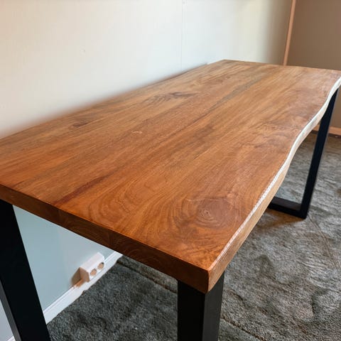 Spisebord av heltre. Bordplaten har naturlig kant på langsidene. Understell i metall.