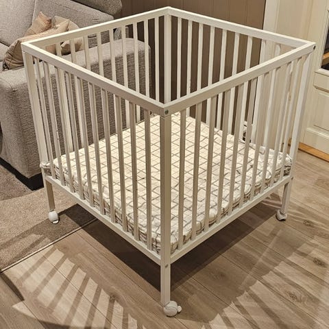 Eldre sprinkelseng gies bort, uten madrass. Trenger et strøk maling. 60 cmx 120 cm. Må hentes i Knarrevik i Øygarden kommune etter avtale.