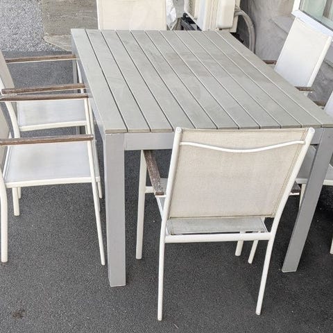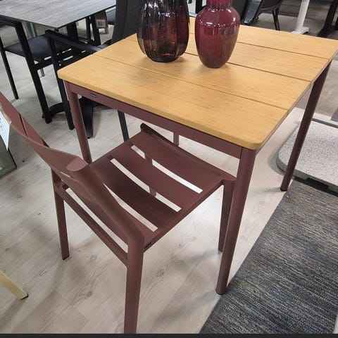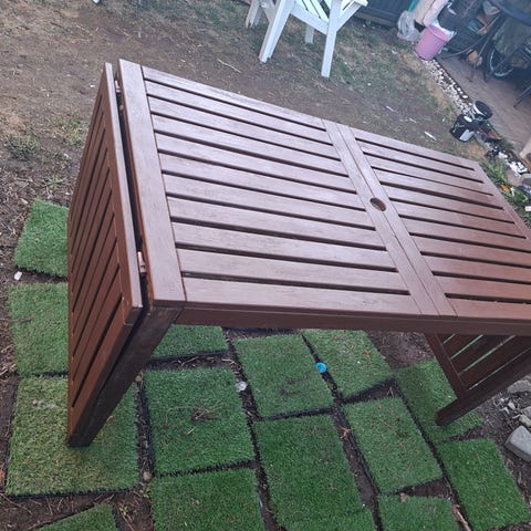Solid og stabilt spisebord med to stoler i IKEAs gamle Falster-serie. Bordet måler 63 x 63 og er 75 cm høyt. Materialet er i tre og metall. Plankene er i behandlet treverk, vedlikeholdsfritt, men er noe preget i fargen av å ha stått ute. (Ikke fuktskader men bare i fargenyanser.) Ingen rust. Alle delene er ellers uskadet, stabile og hele. Passer til liten spiseplass i hagen/ på balkong/uteplass.