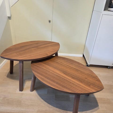 Det ene bordet er i god stand. Det andre har noen synlige bruksmerker på overflaten (se bilder), men er fortsatt solid og fullt funksjonelt.