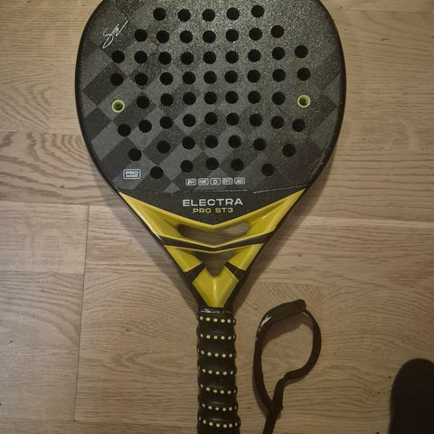 NOX hybrid racket som er 26-modellen Agustin Tapia spiller med. Fikk en kakk i mot glasset, men har ikke påvirket motstand i racket enda. Denne har nok en god stund igjen, men selges rimelig til fordel for attack versjonen.