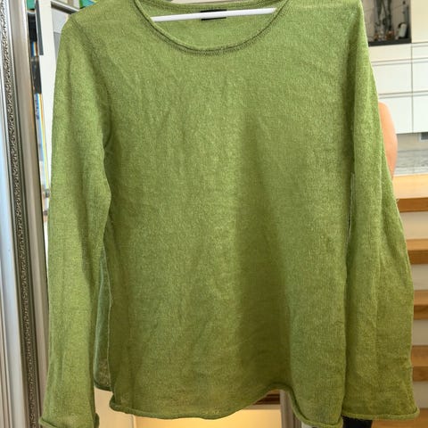 Genser for dame i størrelse 38. Genseren er i grønn- og hvitmønstret bomull med rund hals og lange ermer. Modellen har påsydde lommer foran med avvikende grønt mønster. Passer til hverdagsbruk og kan kombineres med både bukser og skjørt.
