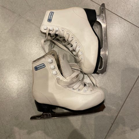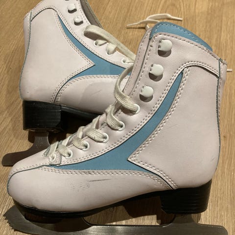 Kunstløpskøyter i størrelse 37/38. Skøytene har hvit overdel med blå detaljer og snøring foran for justerbar passform. Bladene er merket 37/38 og er festet med skruer til sålen. Egner seg til bruk på isbaner og skøytebaner for barn eller ungdom som trenger skøyter i denne størrelsen. Bør antakelig slipes.