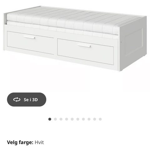 IKEA dagseng med skuffer i hvit. Sengen har to uttrekksskuffer som gir ekstra oppbevaringsplass. Sengen er i fin stand, ingen synlige bruksmerker. Men den ene planken under madrass er knekt, men festet sammen. Madrass og overmadrass kan følges med om det er ønskelig.